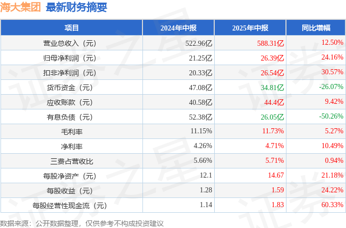 据证券之星公开数据整理,近期海大集团(002311)发布2025年中报。截至本报告期末A策略,公司营业总收入588.31亿元,同比上升12.5%,归母净利润26.39亿元,同比上升24.16%。按单季度数据看,第二季度营业总收入332.02亿元,同比上升14.0%,第二季度归母净利润13.56亿元,同比上升7.26%。本报告期海大集团盈利能力上升,毛利率同比增幅5.27%,净利率同比增幅10.49%。