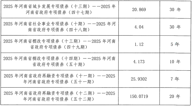 发行的2025年河南省政府再融资专项债券(十二期)共计150.0719亿元,置换存量隐性债务。