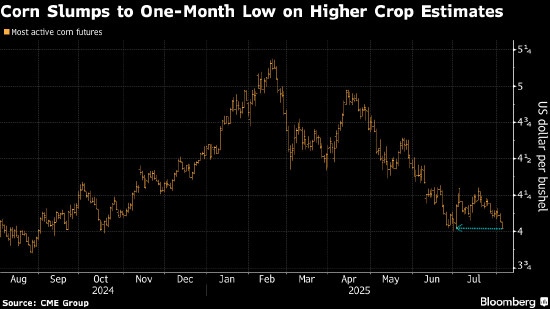 玉米期货价格连续第三个交易日下跌,此前美国产量预估强劲,市场对供应过剩的担忧导致价格跌至一个月来最低。